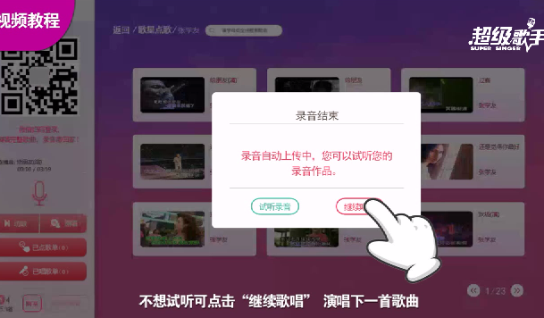 4錄音只有一次機(jī)會(huì),當(dāng)你演唱完后,歌曲自動(dòng)上傳服務(wù)器上,當(dāng)中,你可以試聽錄音效果,也可以點(diǎn)擊繼續(xù)唱歌。