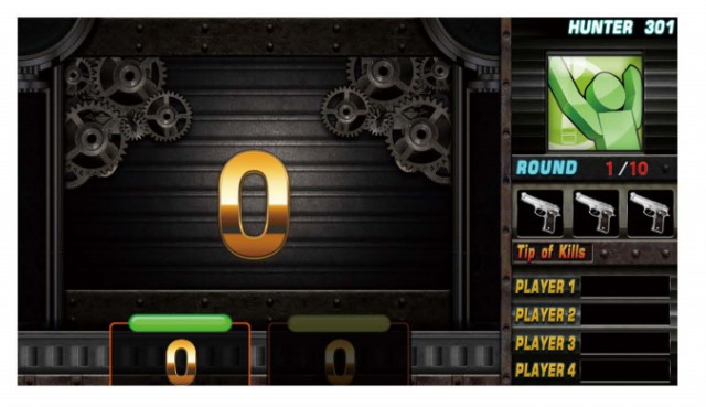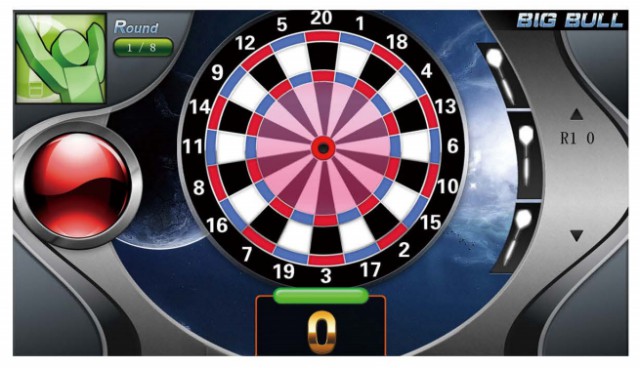 此游戲可投擲飛鏢以槍的圖案顯示, 屏幕中間出現(xiàn)彩色豎條表示玩家當前分數(shù)。