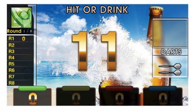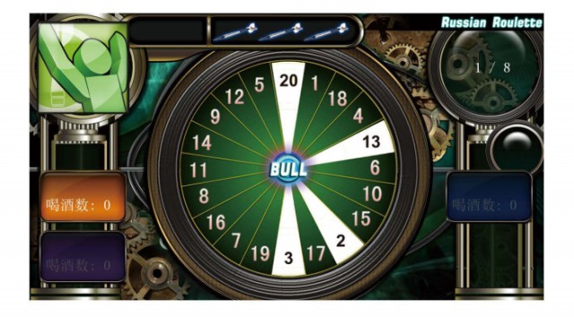 每輪以屏幕上顯示的分區(qū)和紅心為目標, 投中即可獲得相應分數(shù), 若3鏢內(nèi)未能投中則得分減半, 并罰酒一杯, 最后得分最高者獲勝。