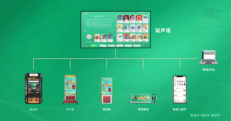 以“朗讀亭” “桌面聽書機”“朗讀終端” “留聲墻” “留聲卡”為載體,建設 書香校園,有聲校園等主題文化。